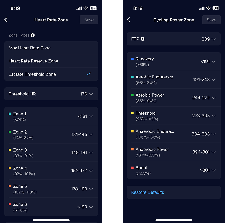 Schwellenwert-HF-Zonen aus der COROS-App, Leistungszonen aus derCOROS-App