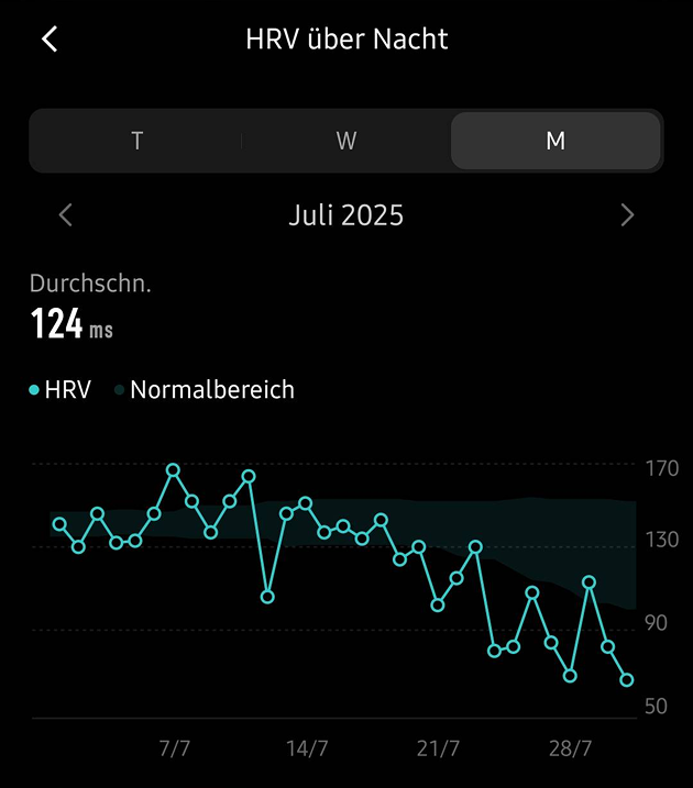 Es ist außerdem hilfreich, längere Trends im Blick zu behalten. In der App kannst du die Ansicht „Monat“ wählen, um Veränderungen über die Zeit besser zu erkennen. Wenn viele Werte unter deinem normalen Bereich liegen oder ein Abwärtstrend sichtbar ist, lohnt es sich, Training und Erholung zu überdenken.