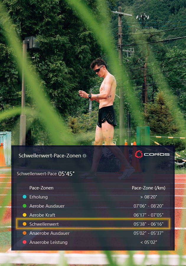 COROS arbeitet mit einem Sechs-Zonen-Modell für Pace und Herzfrequenz. Zone 4 ist dabei deine Schwellenzone – sie liegt zwischen Zone 3 (Aerobe Leistung) und Zone 5 (Anaerobe Ausdauer). Diese Zone spielt eine entscheidende Rolle in deiner Trainingssteuerung. COROS gibt dir sowohl eine Schwellenpace als auch eine Schwellenherzfrequenz an, sodass du je nach Trainingsvorliebe tempo- oder herzfrequenzbasiert trainieren kannst.