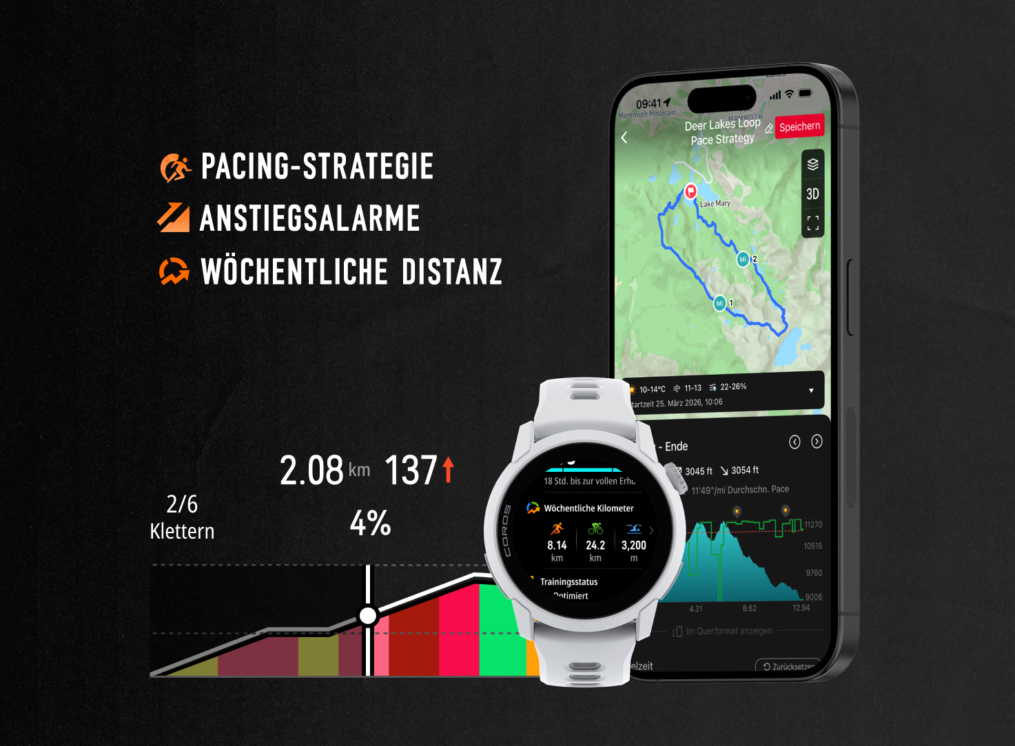 Du kannst während deiner Aktivität Fotos mit der Kamera deines Handys aufnehmen oder die Extender-Funktion der COROS-App nutzen, mit der du direkt Fotos machen kannst, während deine Uhr verbunden ist. Nach Abschluss der Aktivität kannst du außerdem alle Bilder, die du außerhalb der App aufgenommen hast, für deine Aktivitätsübersicht auswählen (Bilder, die über Extender aufgenommen wurden, werden automatisch eingebunden). Beim Erstellen des Videos erscheint jedes Bild genau an der Stelle, an der du es aufgenommen hast. So hältst du Momente fest, die dein Erlebnis besonders machen, und verwandelst deine Aktivitätsdaten in eine teilbare Geschichte.