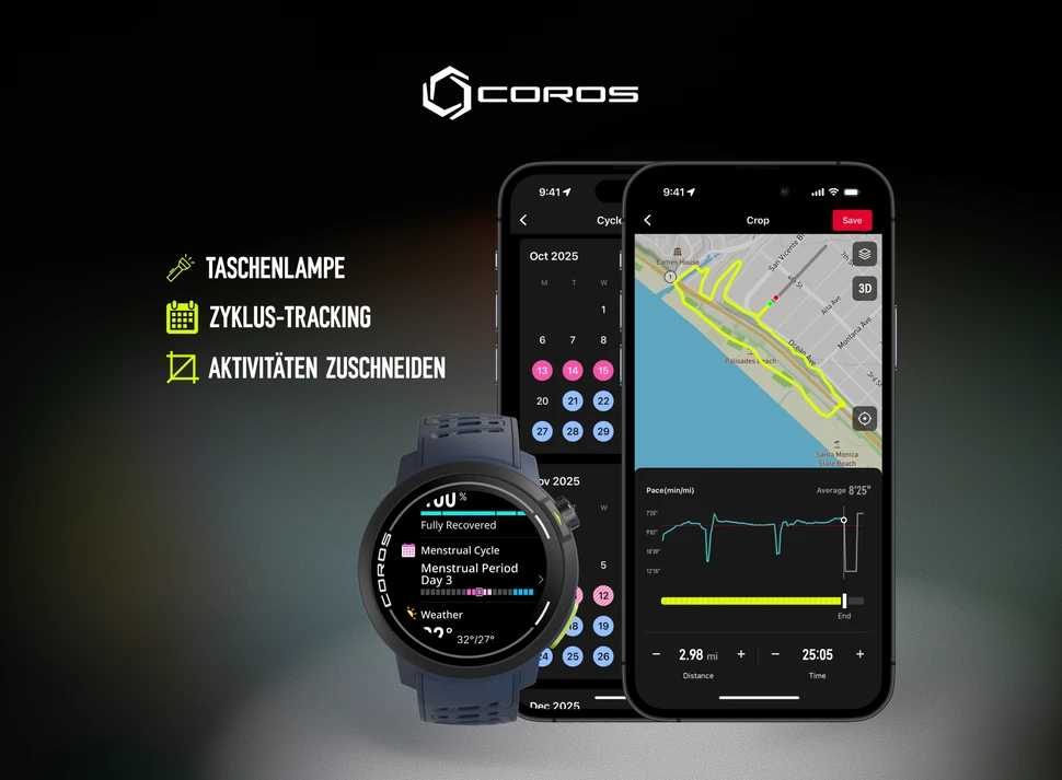 Das neue Update liefert drei praktische Funktionen für dein COROS-Gerät, mit denen du deine Daten genauer hältst, deinen Zyklus besser verstehst und dich auch im Dunkeln besser zurechtfindest.